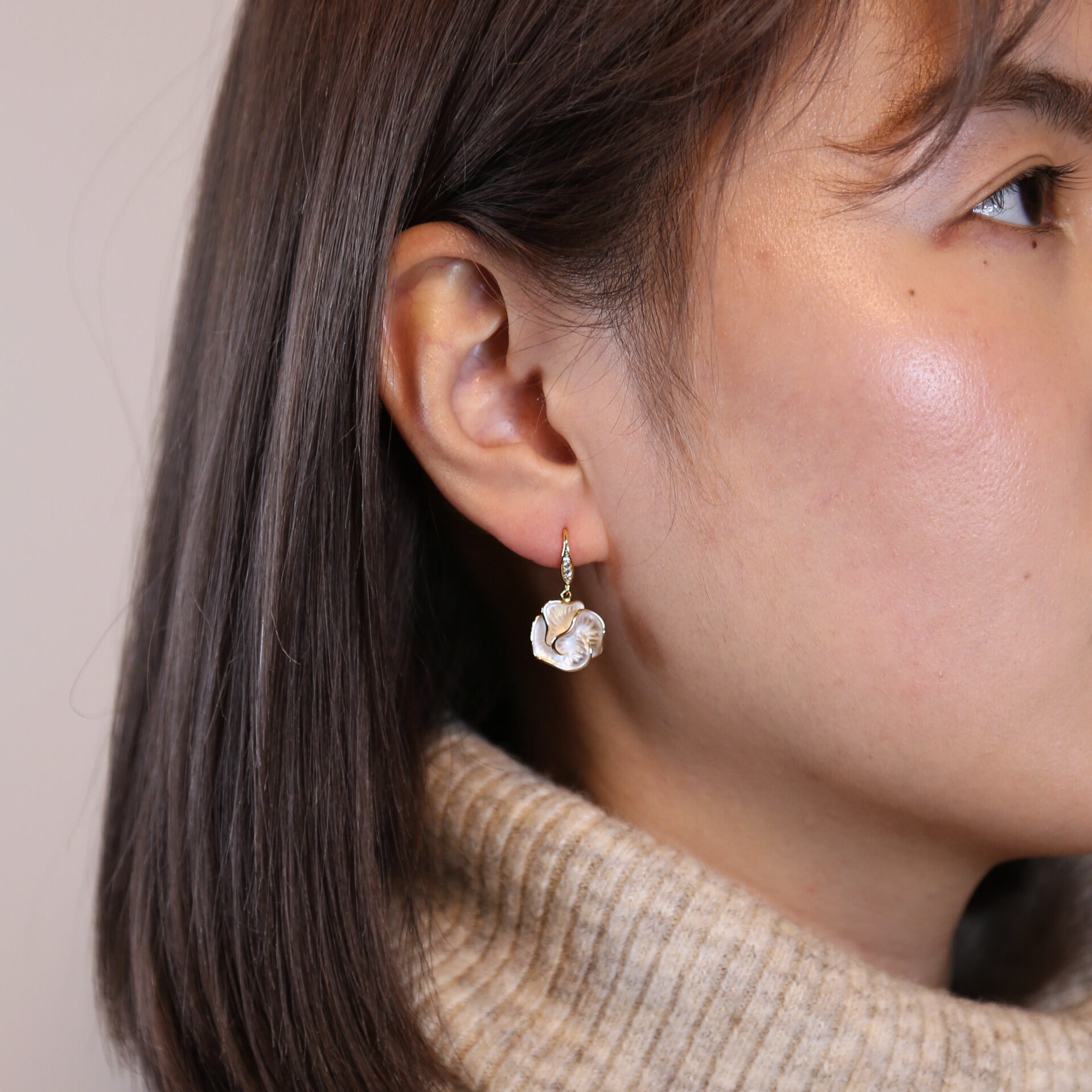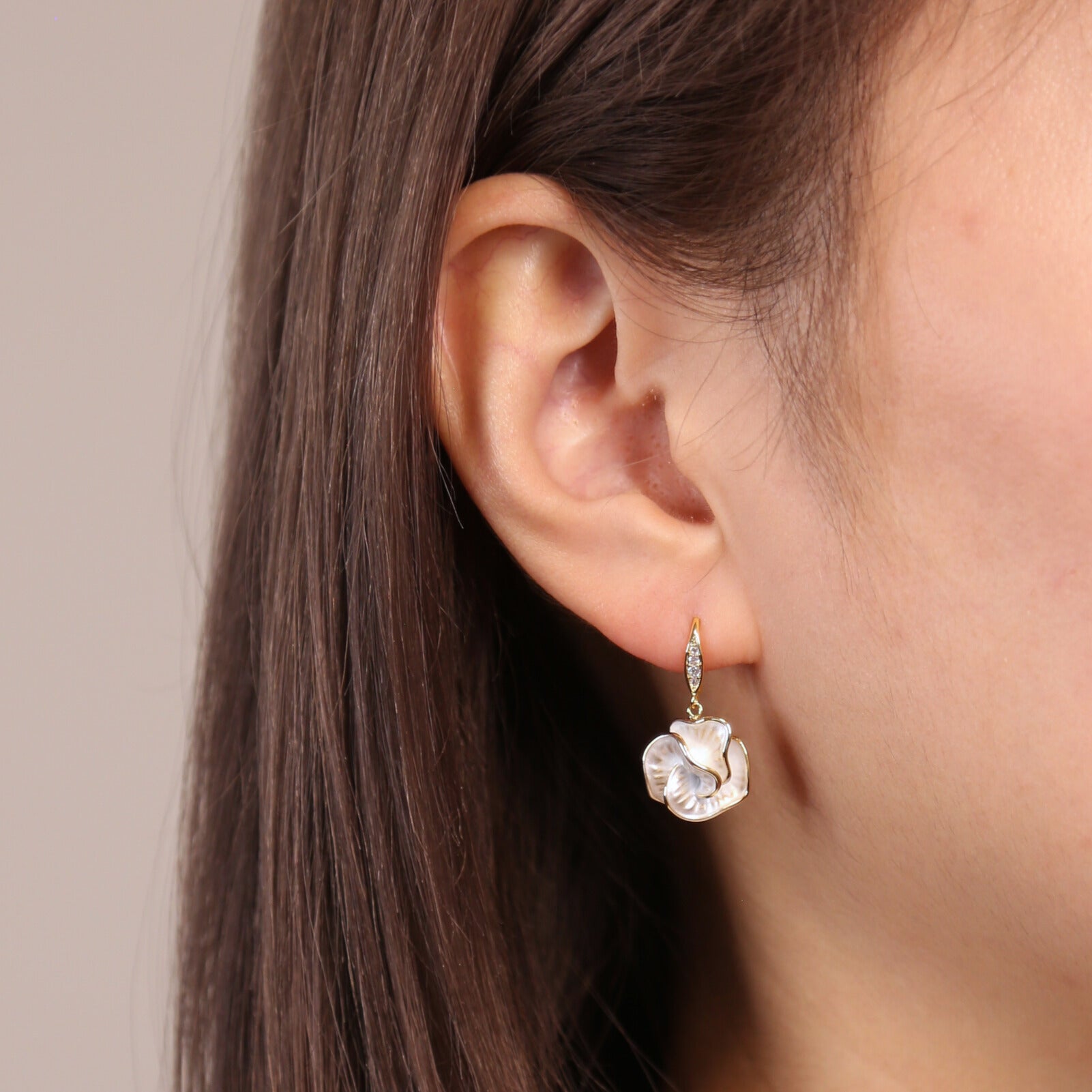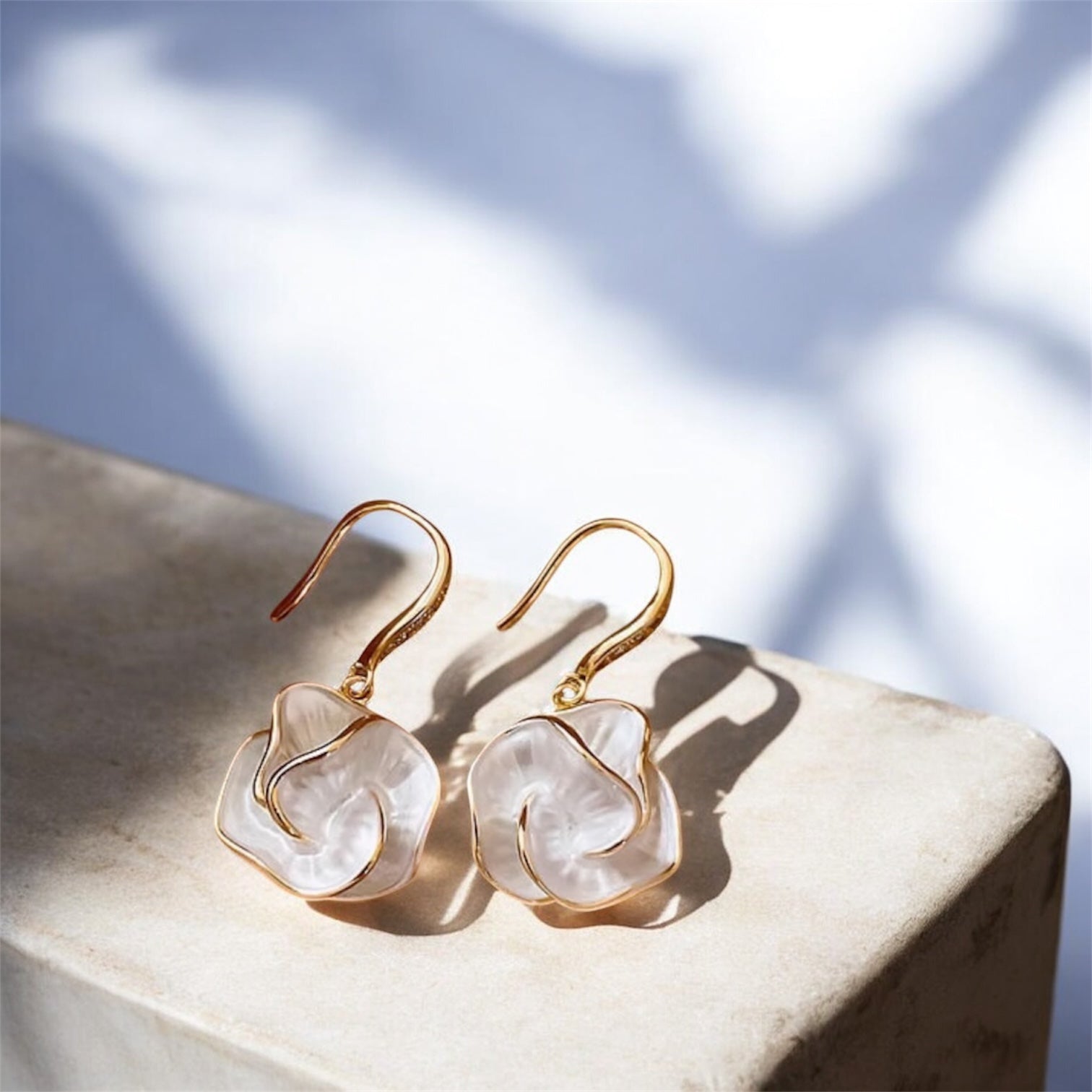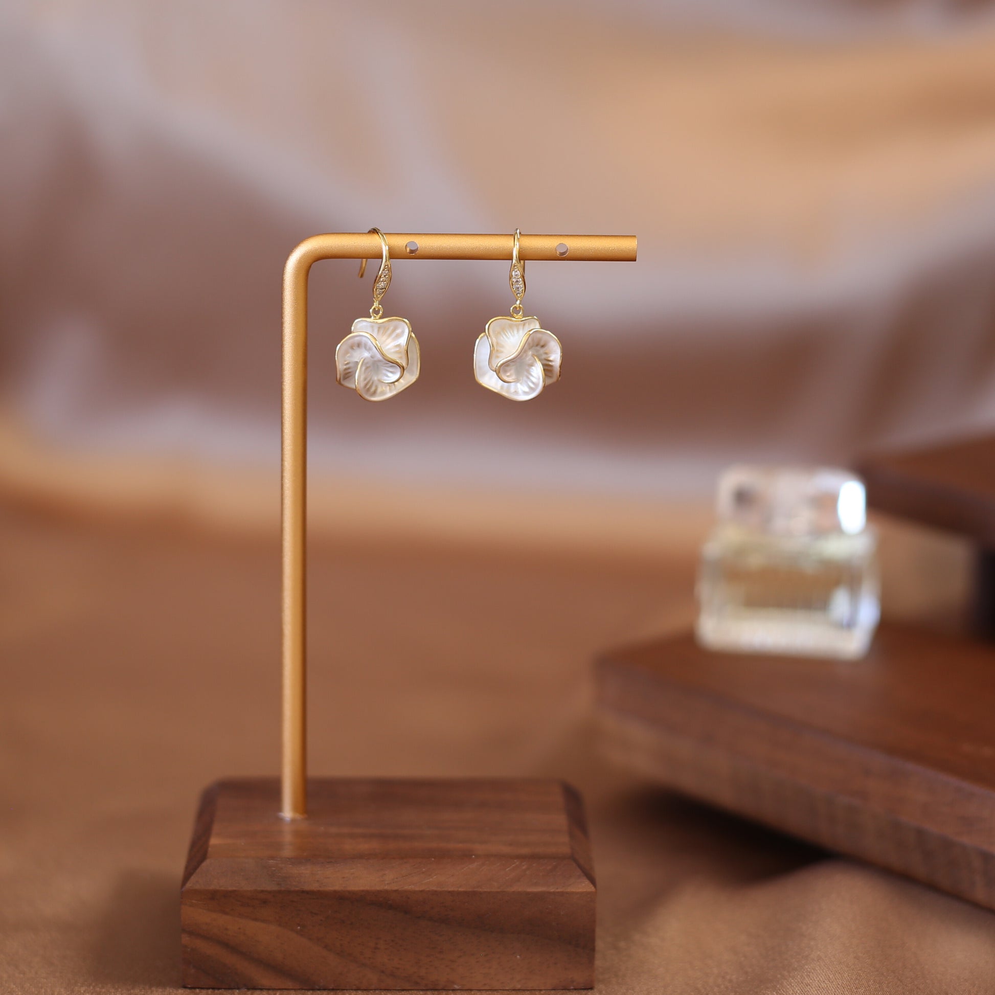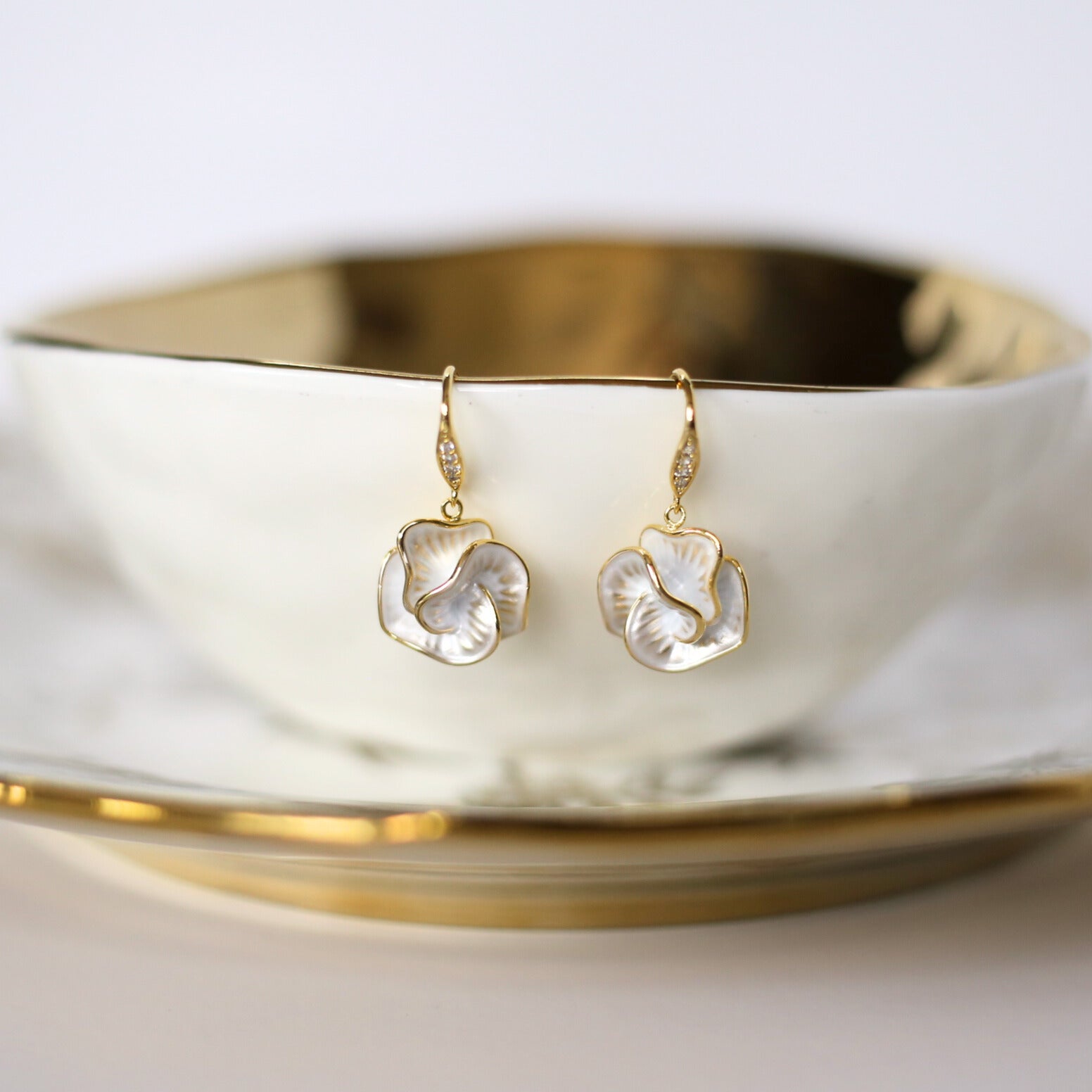 Delicately crafted in sterling silver, these golden camellia-shaped earrings dangle gracefully from the earlobe. Soft white accents highlight each petal, bringing a luminous, feminine touch to this elegant floral design.