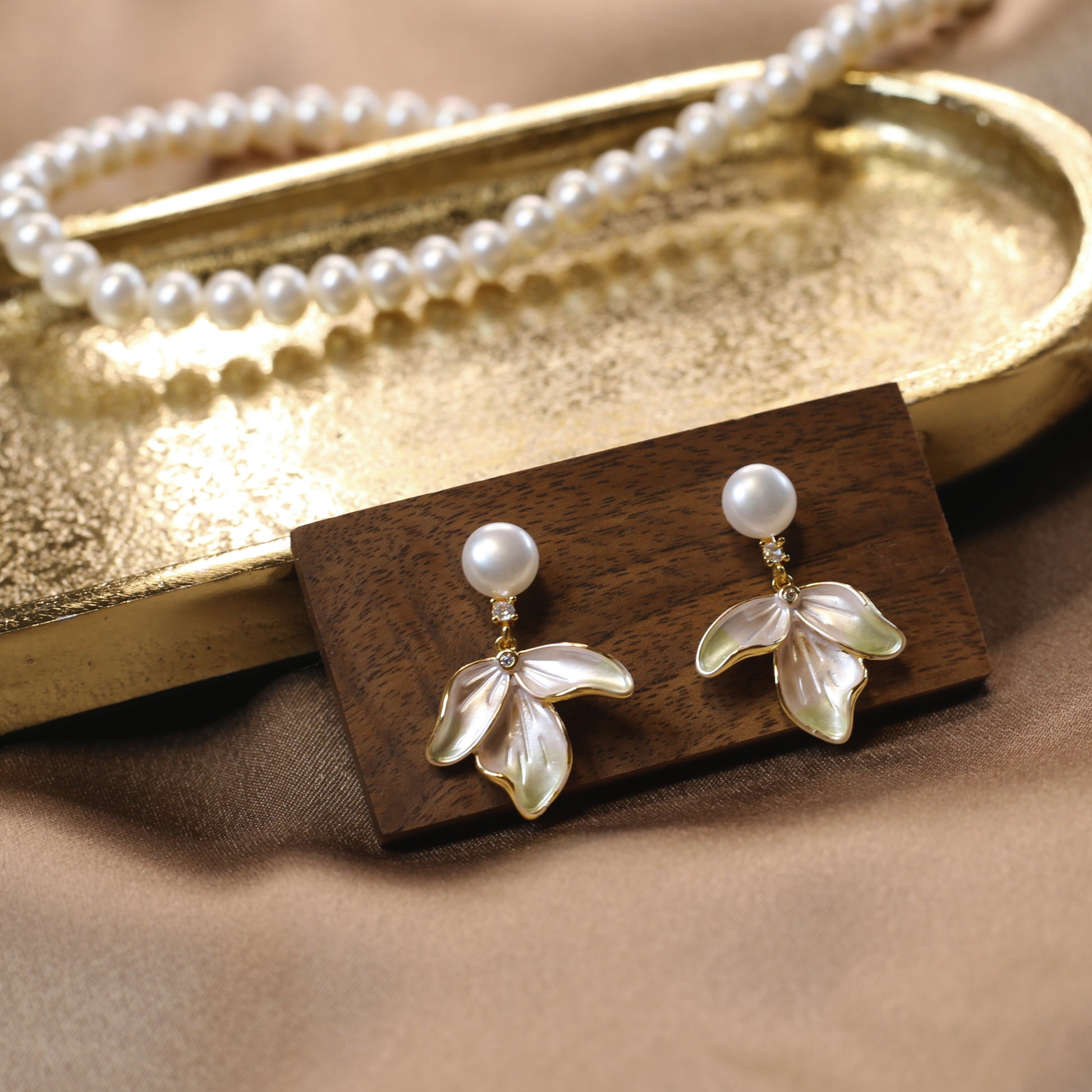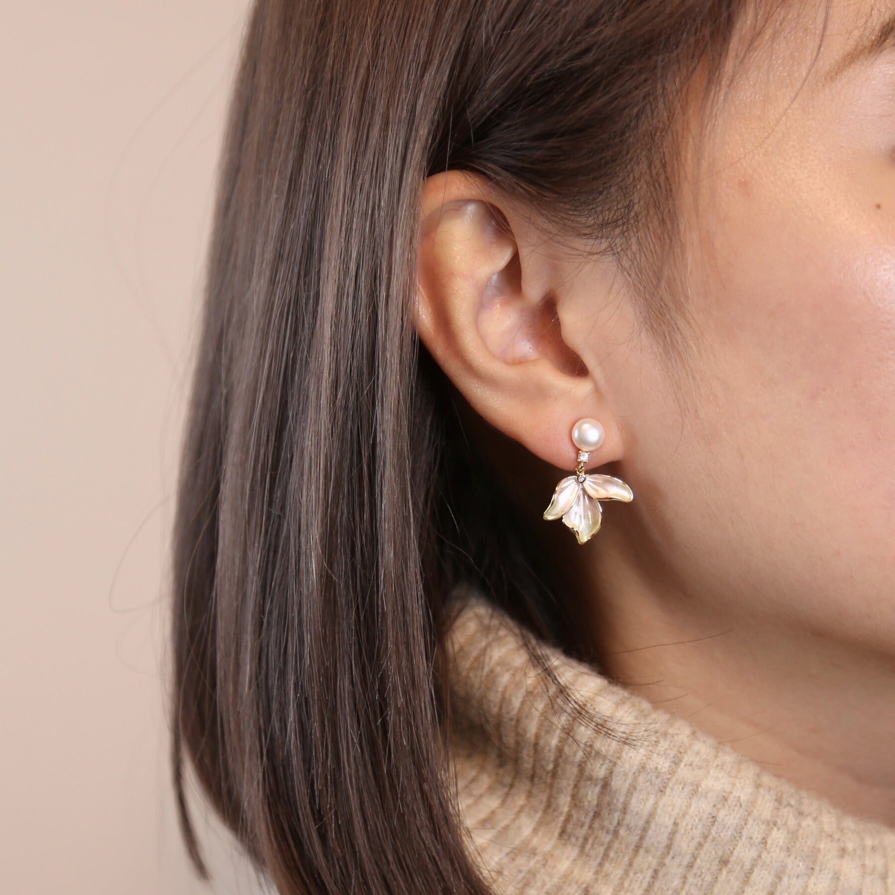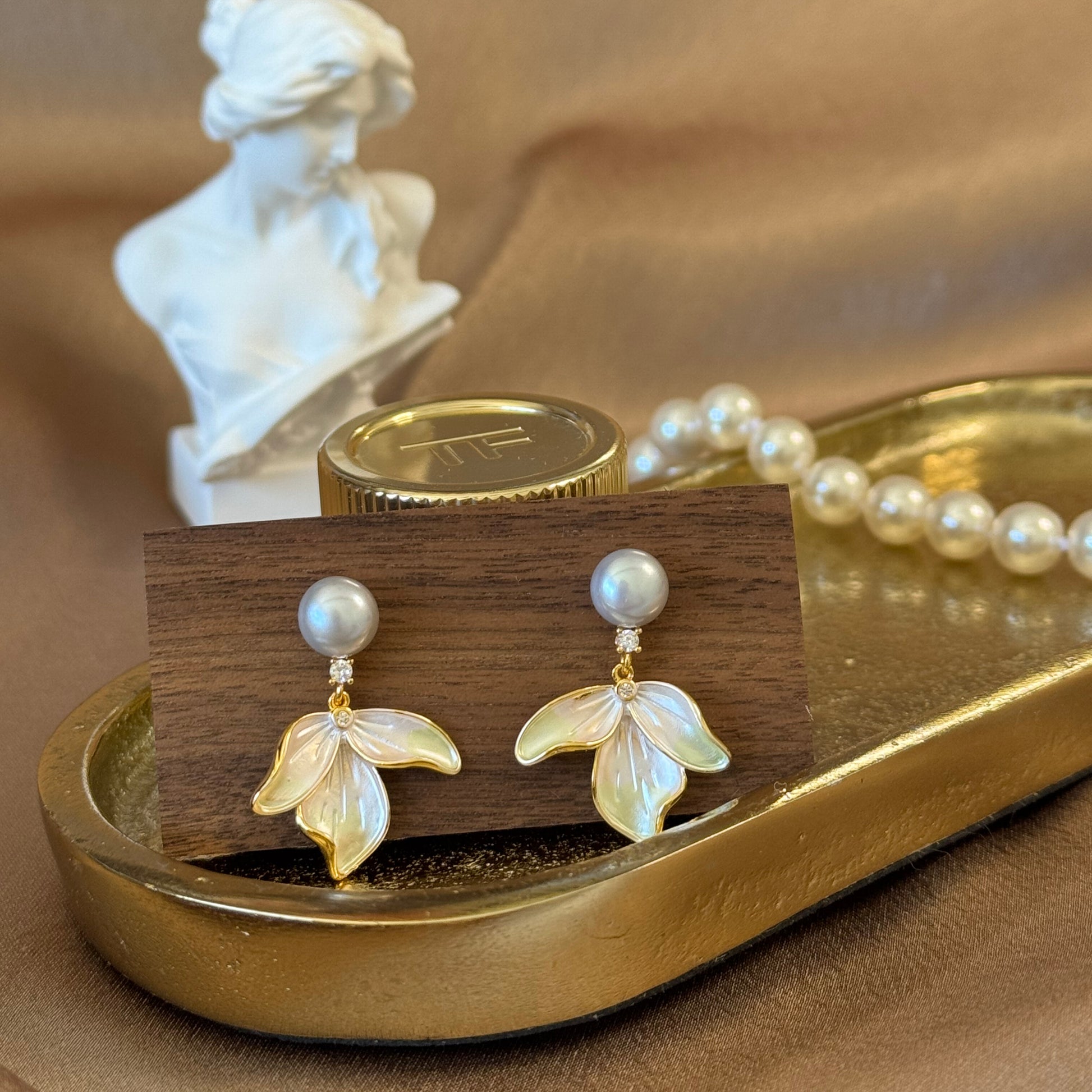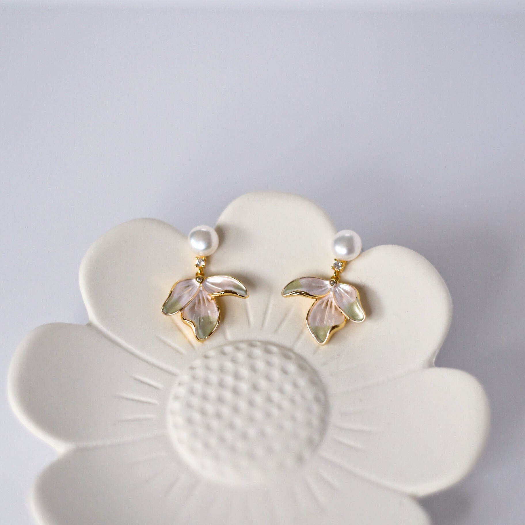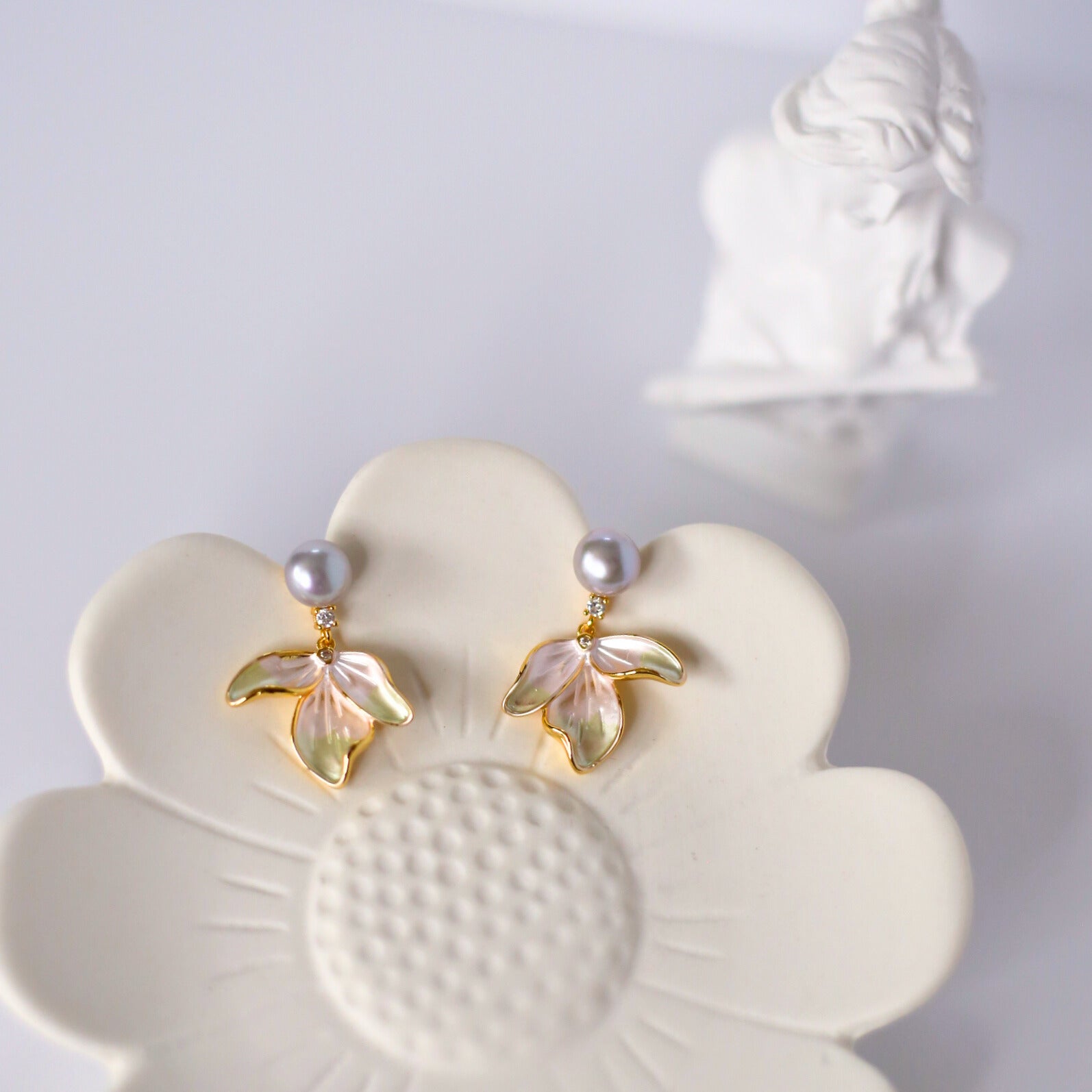 Featuring a 7mm freshwater pearl and a colorful, three-tailed fishtail design, these earrings bring playful elegance and ocean-inspired charm to any look.