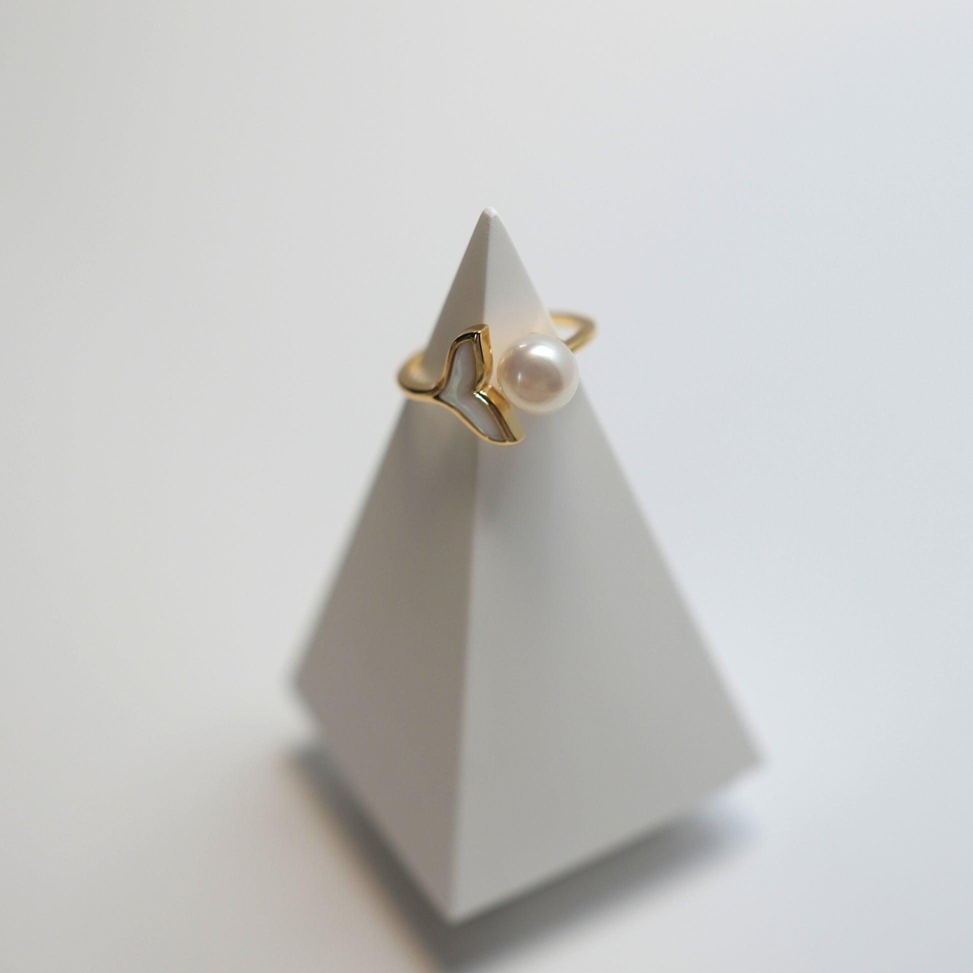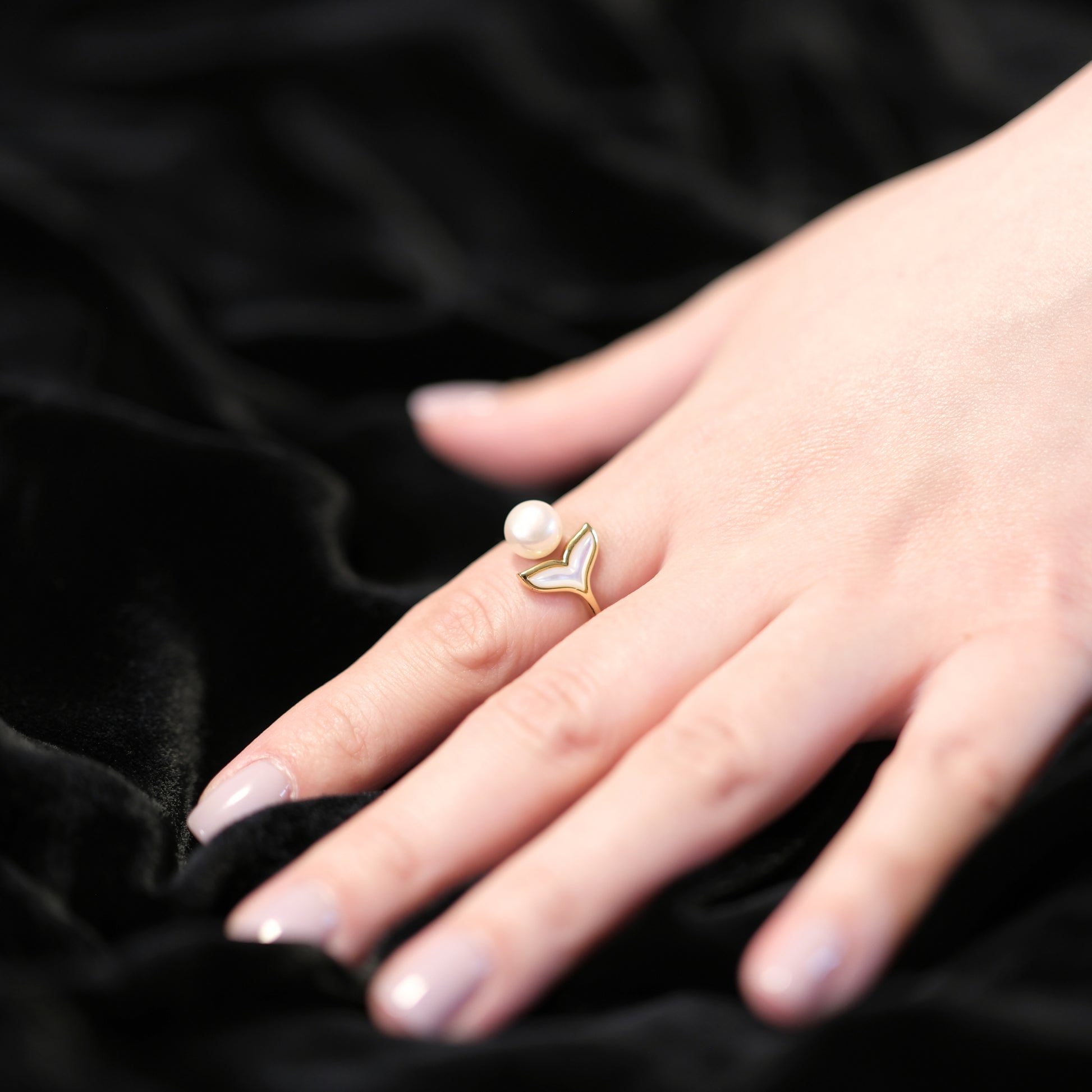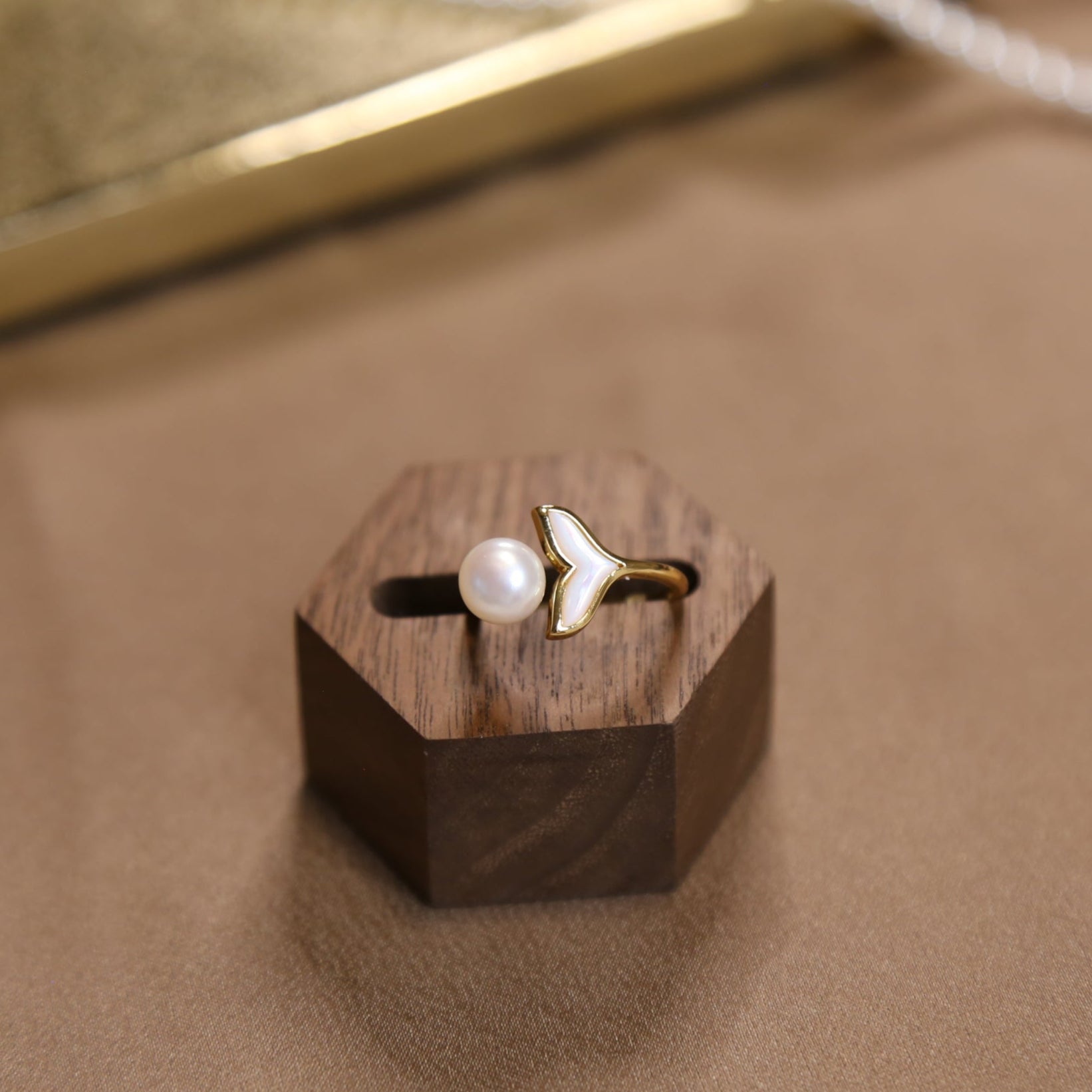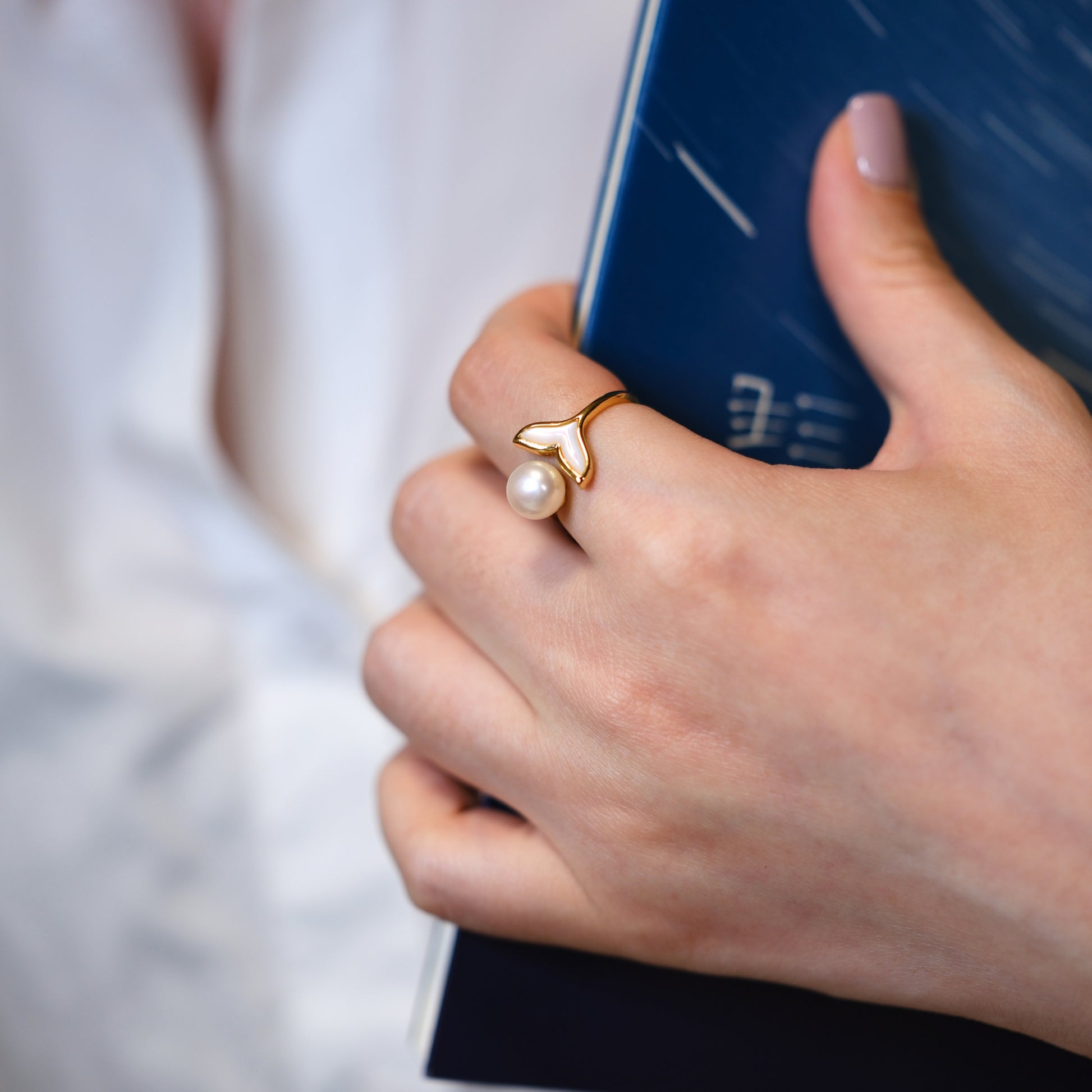 This open ring pairs a luminous freshwater pearl with a delicate fishtail detail, capturing the graceful charm of the sea in a minimal, elegant design.