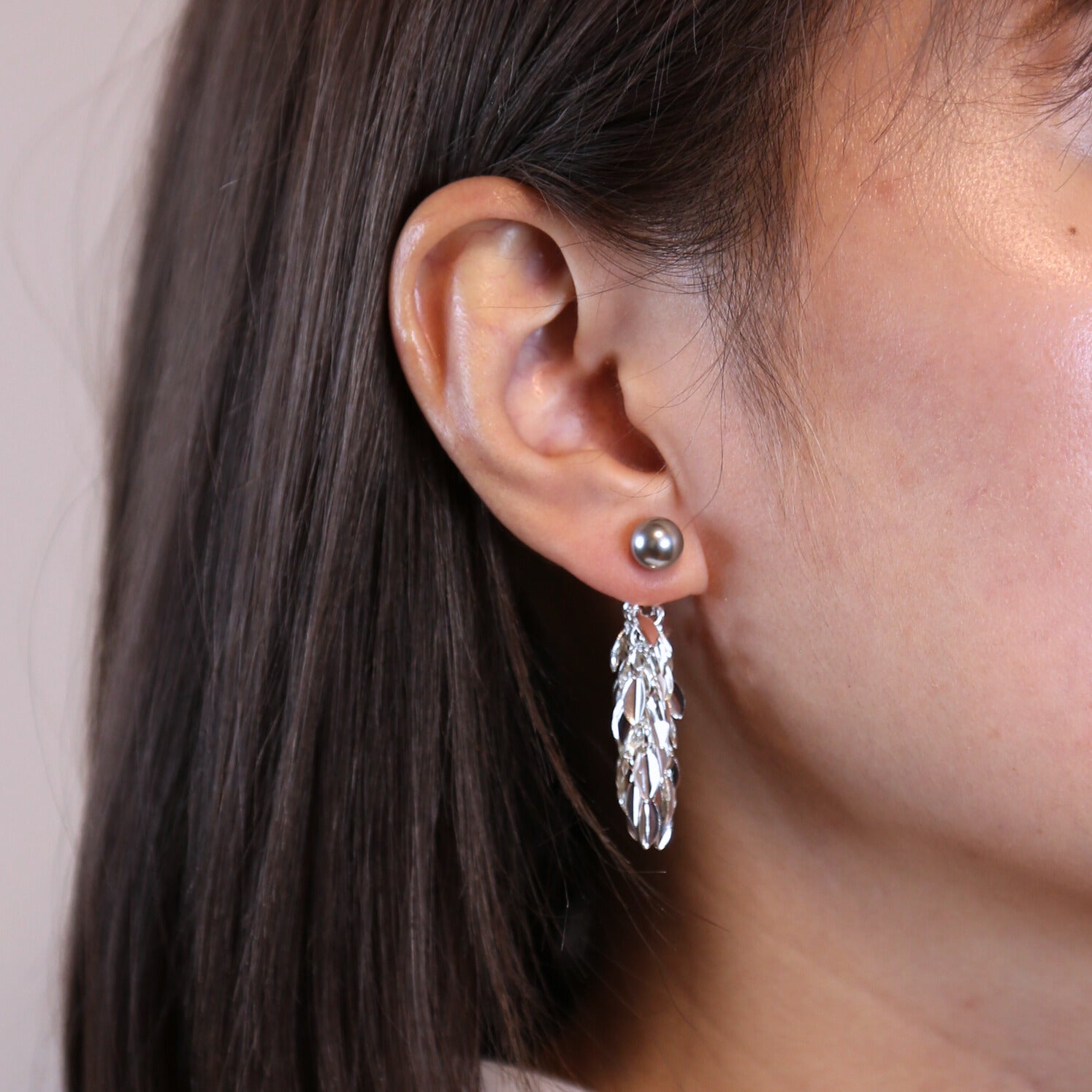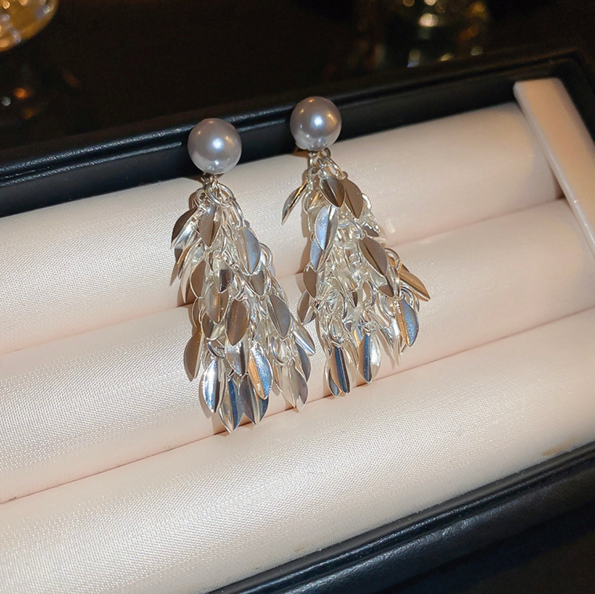 Elegant and eye-catching, these earrings feature a luminous imitation pearl atop dynamic silver-toned tassels that catch the light with every movement, adding radiant shine to any outfit.